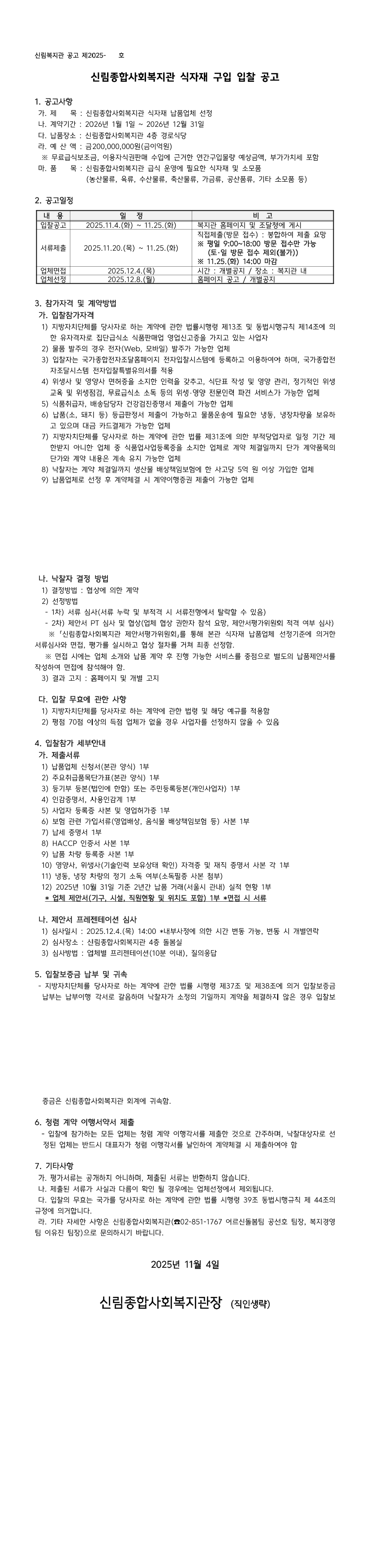 2026년도 신림종합사회복지관 식자재 납품업체 선정 |