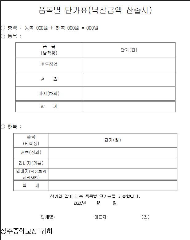 가. 건 명: 2026학년도 상주중학교 학교주관 교복(동복, 하복) 구매