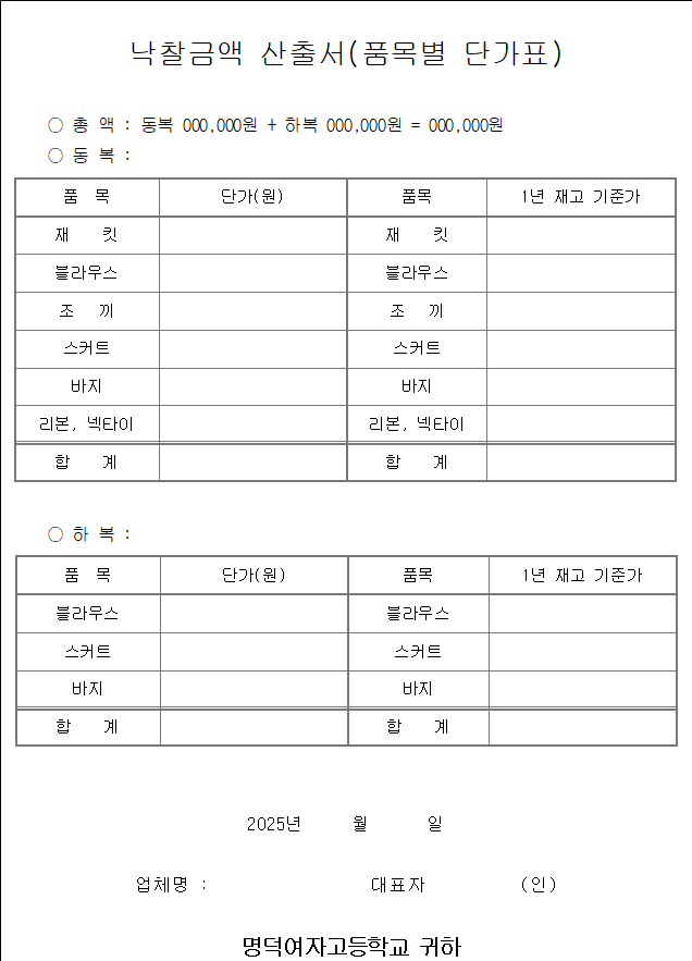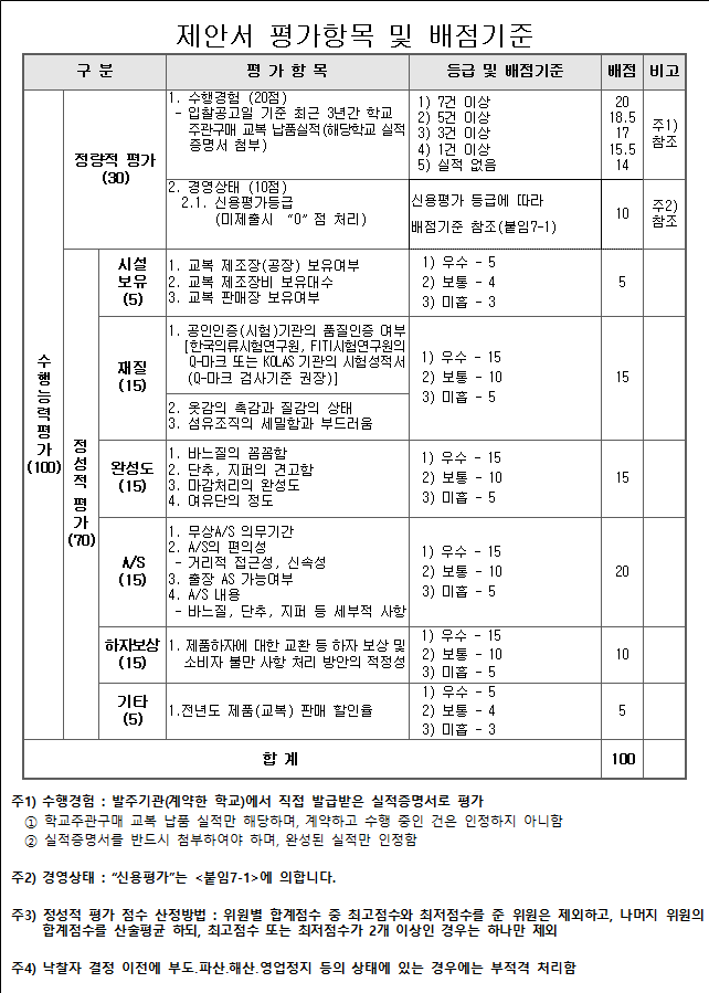 - 전년도 제품(교복) 납품을 희망할 경우, 제안서 제출 시 교복 1벌의 할인율, 계약시 전년도 제품 1벌의 품목별 가격(품목별 단가표)을 제시