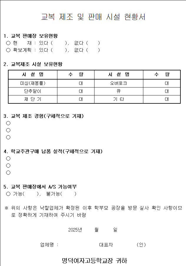 위 사업자는 서울시교육청의 교복가격 안정화를 위한 교복 ‘학교주관구매’ 실시에 따라, 명덕여자고등학교가 시행하는 교복 ‘학교주관구매’가 원만히 추진될 수 있도록 2025. 11. 4.일자로 공고한 입찰에 참가하기에 신고합니다.