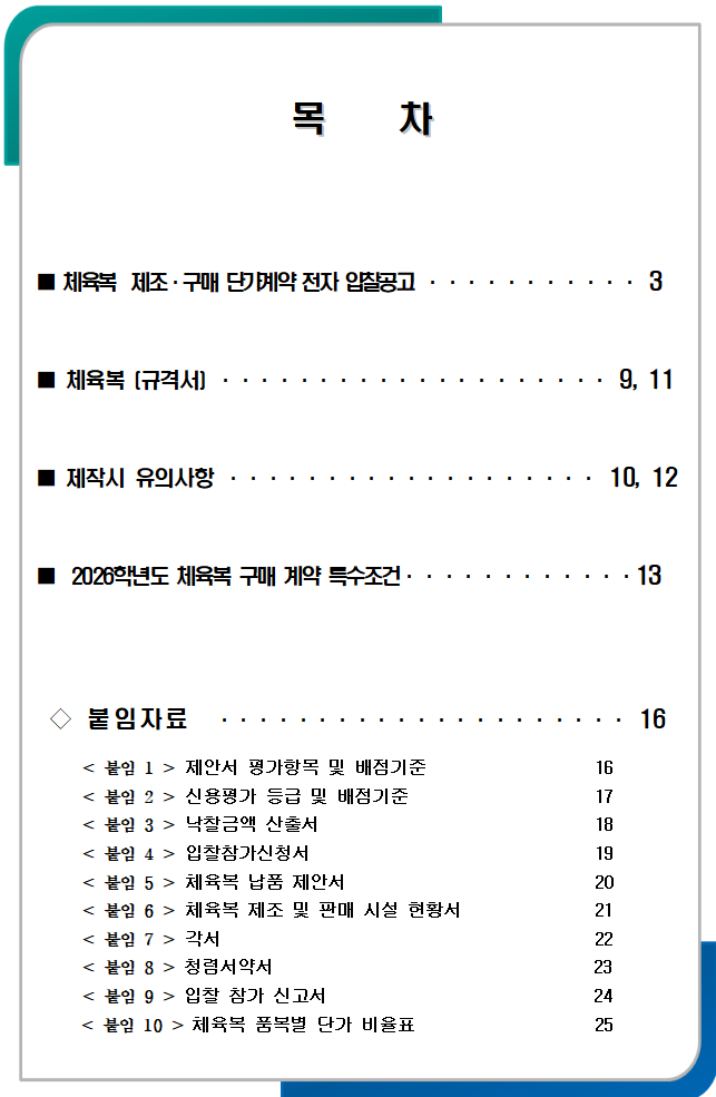 ○ 낙찰업체는 본교와 계약 시 체육복(생활복) 각 1벌의 낙찰금액 산출서(품목별 단가표)를 제시하여야 함. ( 붙임 3 )