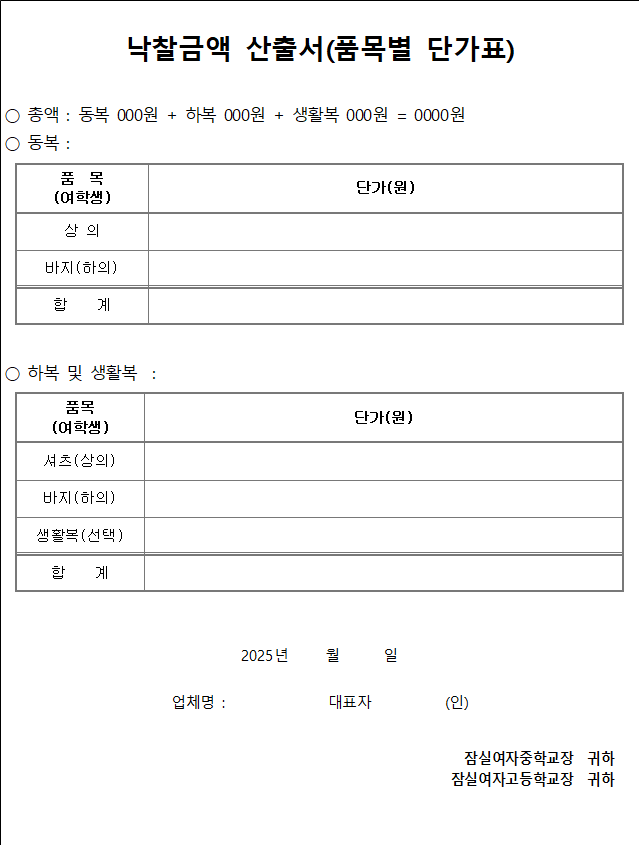 2026학년도 잠실여중, 잠실여고 체육복(생활복) 제조·구매 단가계약 전자입찰 공고