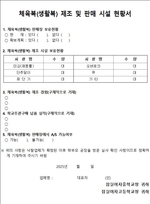 위 사업자는 서울시교육청의 체육복(생활복) 가격 안정화를 위한 체육복(생활복) ‘학교주관구매’ 실시에 따라, 잠실여자중학교, 잠실여자고등학교(주소지 서울시 송파구 소재)가 시행하는 체육복(생활복) ‘학교주관구매’가 원만히 추진될 수 있도록 2025. 10. 15. 자로 공고한 입찰에 참가하기에 신고합니다.
