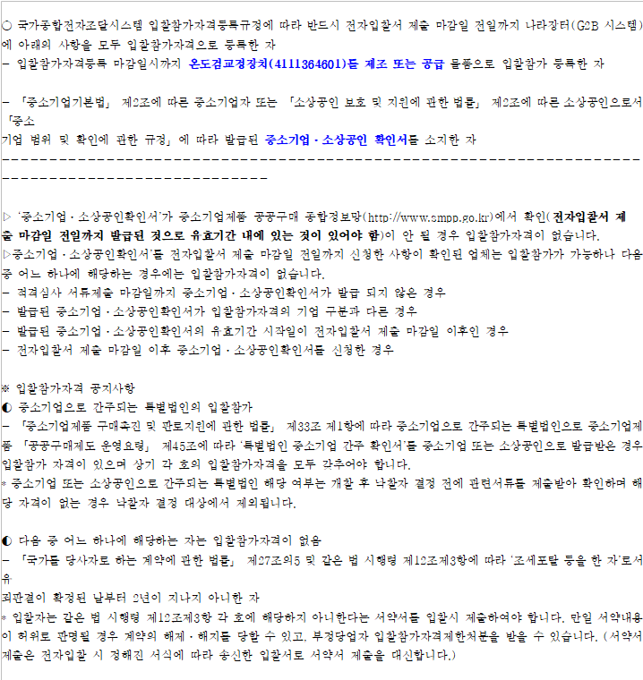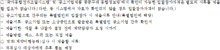 ○ (사후판정) 계약담당자는 「국가종합전자조달시스템 이용약관」 제11조 제1항에 따라 입찰참가자의 제출서류(입찰보증금, 입찰참가자격 포함)에 대한 적정성(적합) 여부를 개찰 이후에도 판정할 수 있습니다.
