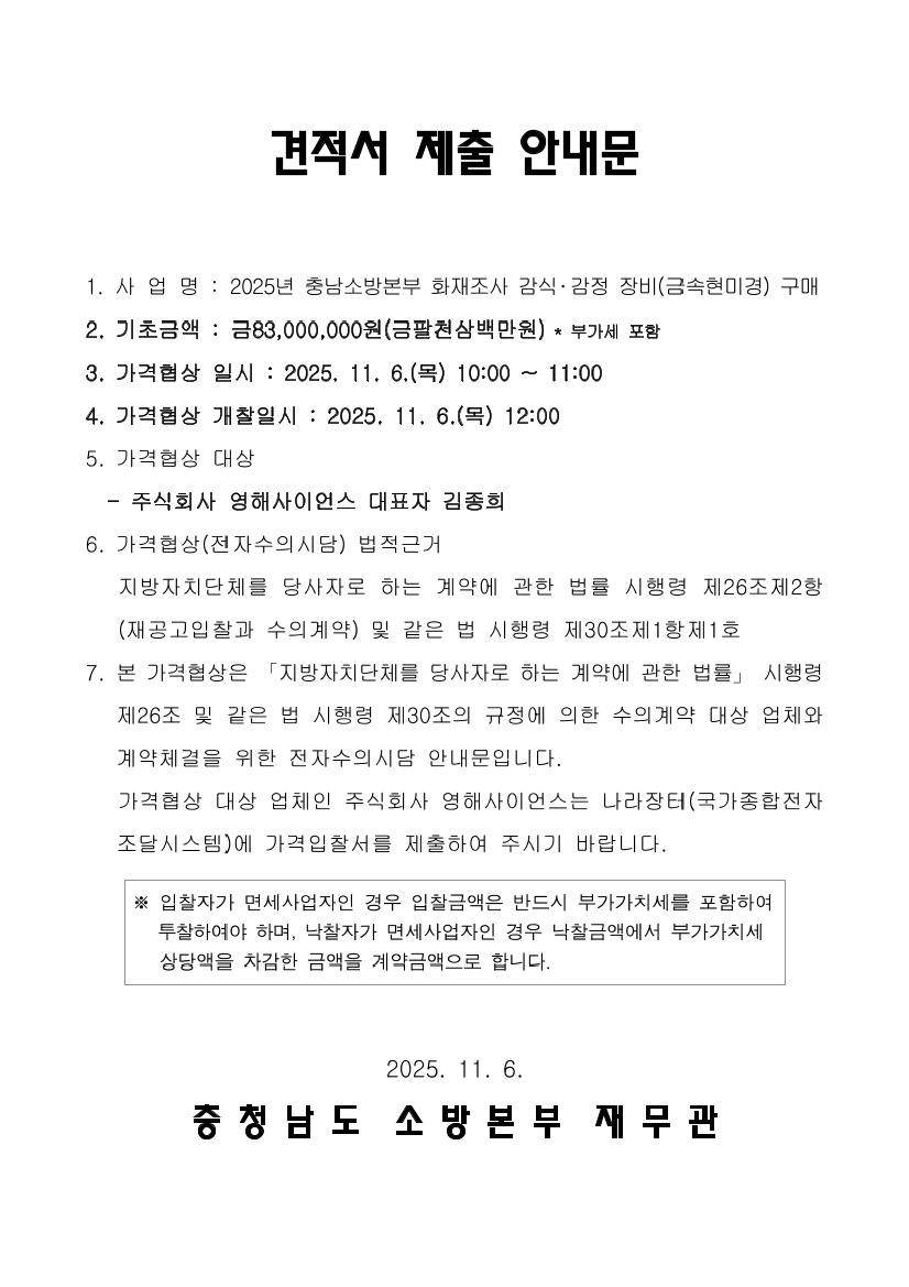 2025년 충남소방본부 화재조사 감식·감정 장비(금속현미경) 구매 |