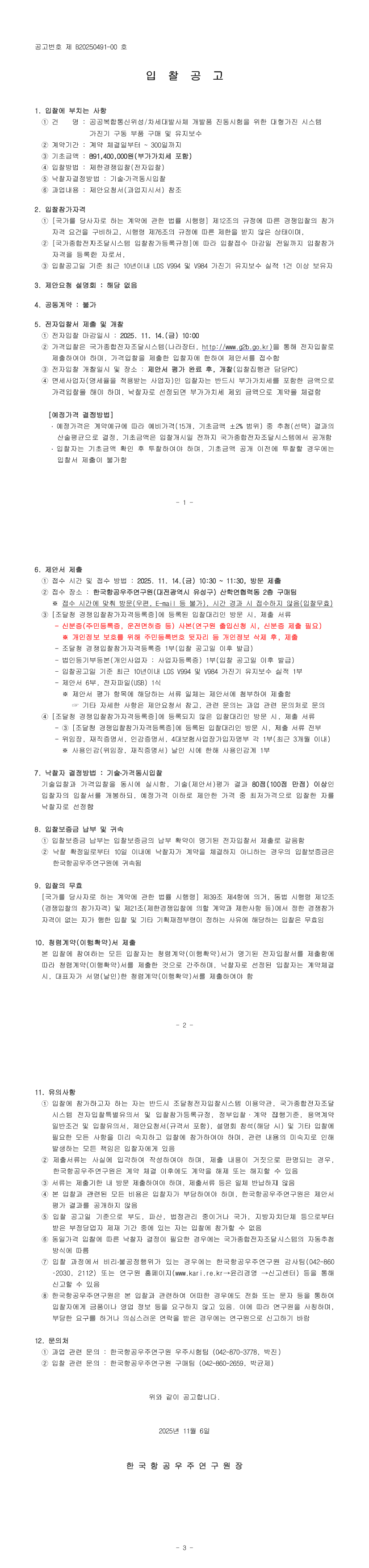공공복합통신위성차세대발사체 개발품 진동시험을 위한 대형가진 시스템 가진기 구동 부품 구매 및 유지보수 |
