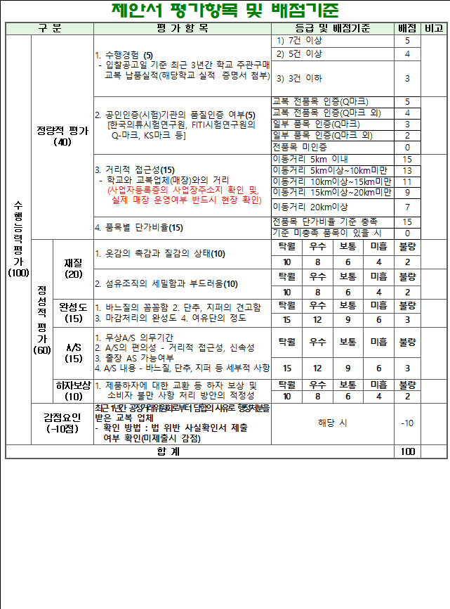 라. 제출서류 (블라인드 심사평가로 제안서, 교복 견본품에 업체명, 업체표시 문양 등을 제거하고 제출)