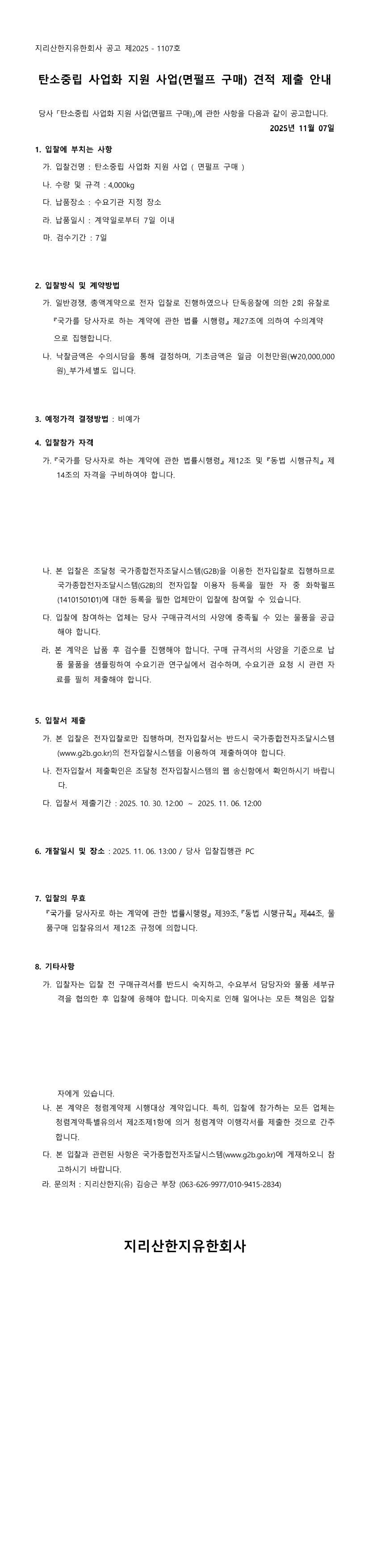 (재공고_단일 응찰로 2회 유찰에 의한 수의계약)탄소중립 사업화 지원사업(면펄프 SANTAFE PULP CMP) |