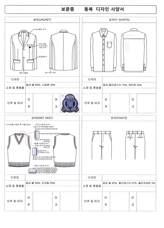 ※ 보문중학교 교복 디자인에 대한 모든 권리는 보문중학교가 가지며, 섬유혼용률은 권장사항으로 신소재 사용 및 설명회 시 심사위원의 요구에 따라 변경될 수 있음.