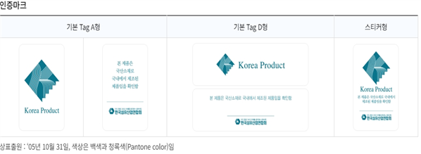 「국산 섬유제품 인증마크」는 국산소재로 국내에서 제조된 섬유제품에 부여하는 인증마크로 국산소재 사용촉진, 국내 생산기반 활성화, 제품경쟁력 제고 및 소비자 신뢰도 향상 등을 위해 한국섬유산업연합회에서 운영하고 있는 민간자율 인증제도임