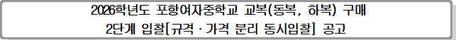 「지방자치단체를 당사자로 하는 계약에 관한 법률 시행령」(이하 〝지방계약법 시행령“이라 한다.) 제18조(2단계 경쟁 등의 입찰)의 규정에 따라 2026년도 신입생 포항여자중학교 교복(동복) 구매 업체 선정을 위해 다음과 같이 공고합니다.