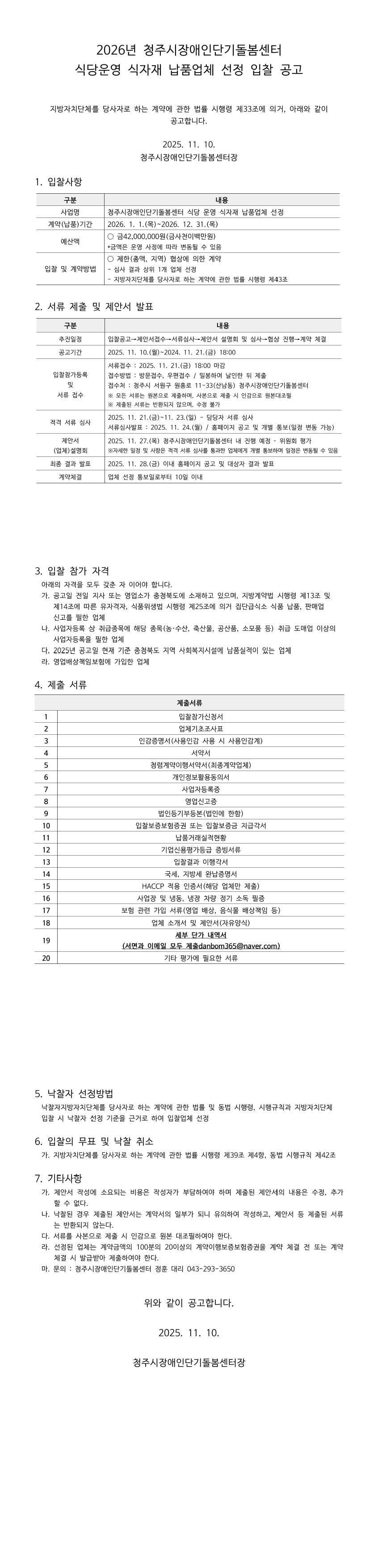 2026년 청주시장애인단기돌봄센터 식당 운영 식자재 납품업체 선정 공고 |