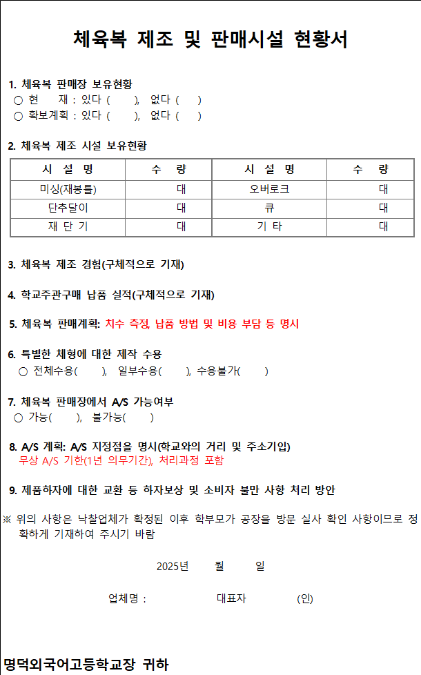 위 사업자는 서울시교육청의 체육복가격 안정화를 위한 체육복 ‘학교주관구매’ 실시에 따라, 명덕외국어고등학교가 시행하는 체육복 ‘학교주관구매’가 원만히 추진될 수 있도록 2025. 00. 00일자로 공고한 입찰에 참가하기에 신고합니다.