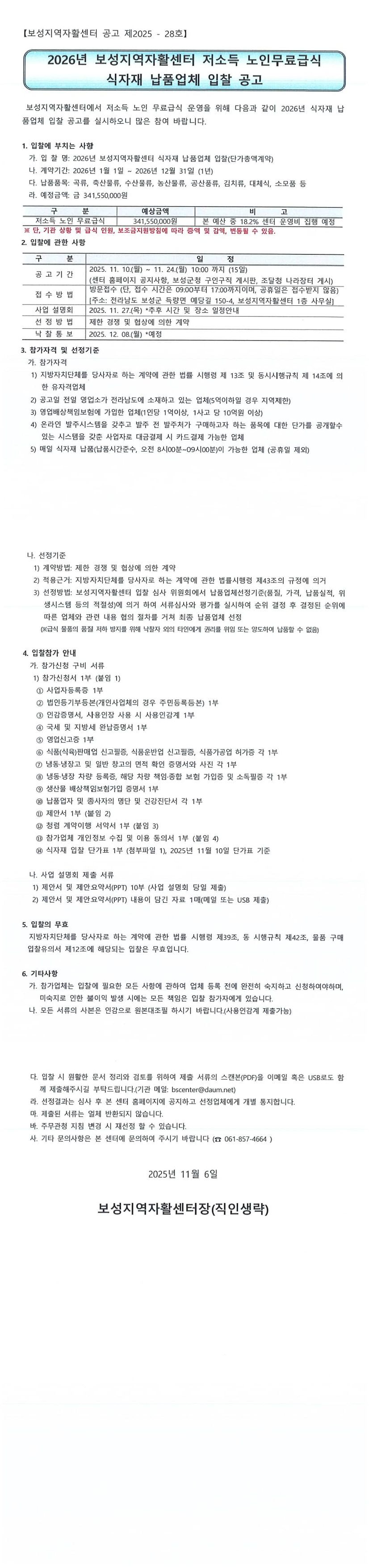 2026년 보성지역자활센터 저소득 노인무료급식 식자재 납품업체 입찰 공고 |