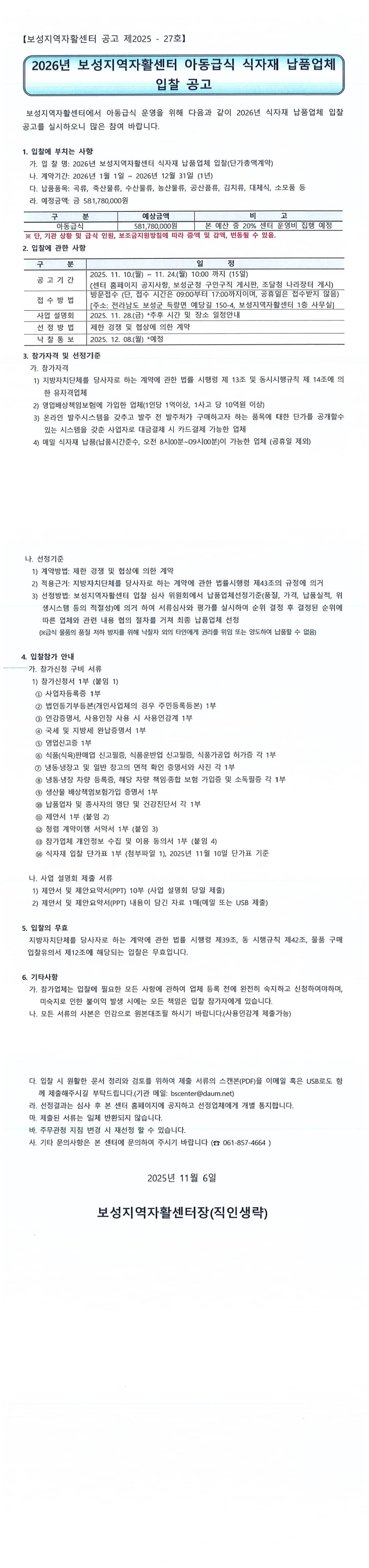 2026년 보성지역자활센터 아동급식 식자재 납품업체 입찰 공고 |