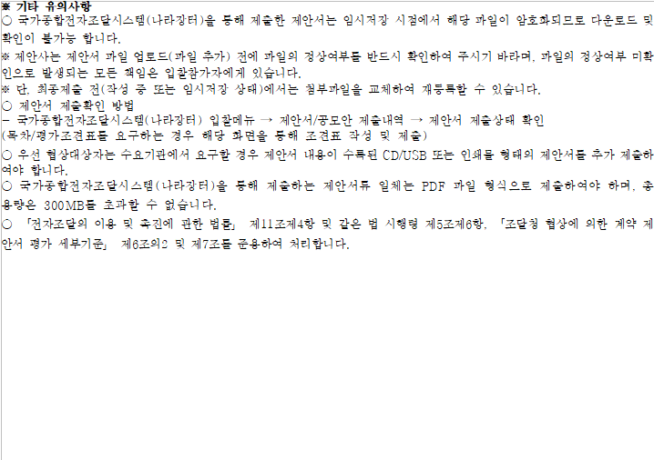 ◇제안서 제출 마감일시에 임박하여 제안서를 제출할 경우 시스템 부하 등으로 제안서 제출이 원활하지 않을 수 있으니, 가급적 제안서 가급적 규격(기술)입찰서 제출 마감일 전일까지 제출하시기 바랍니다.