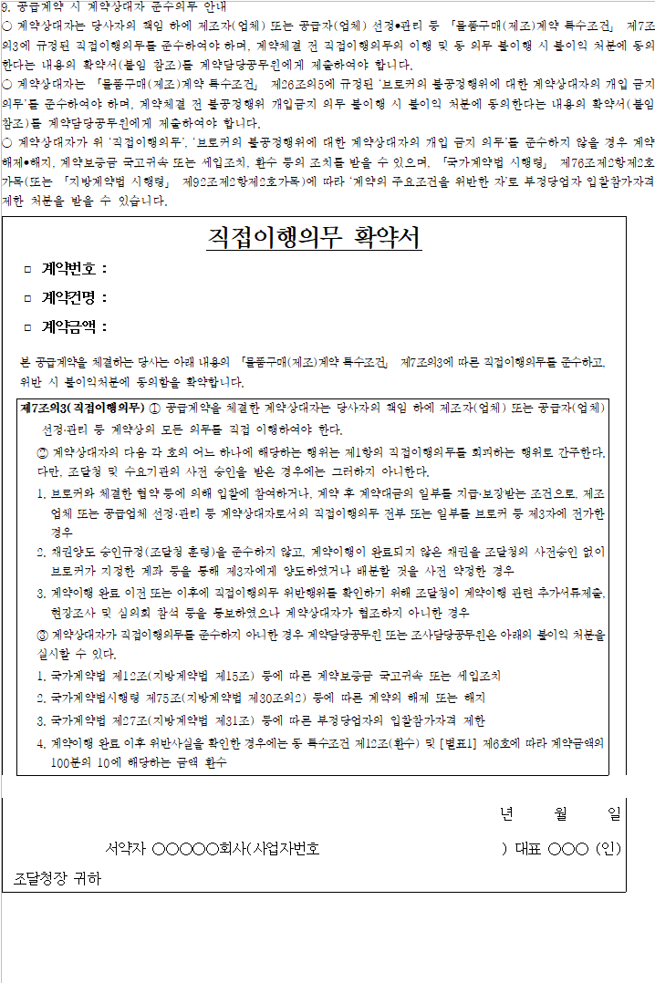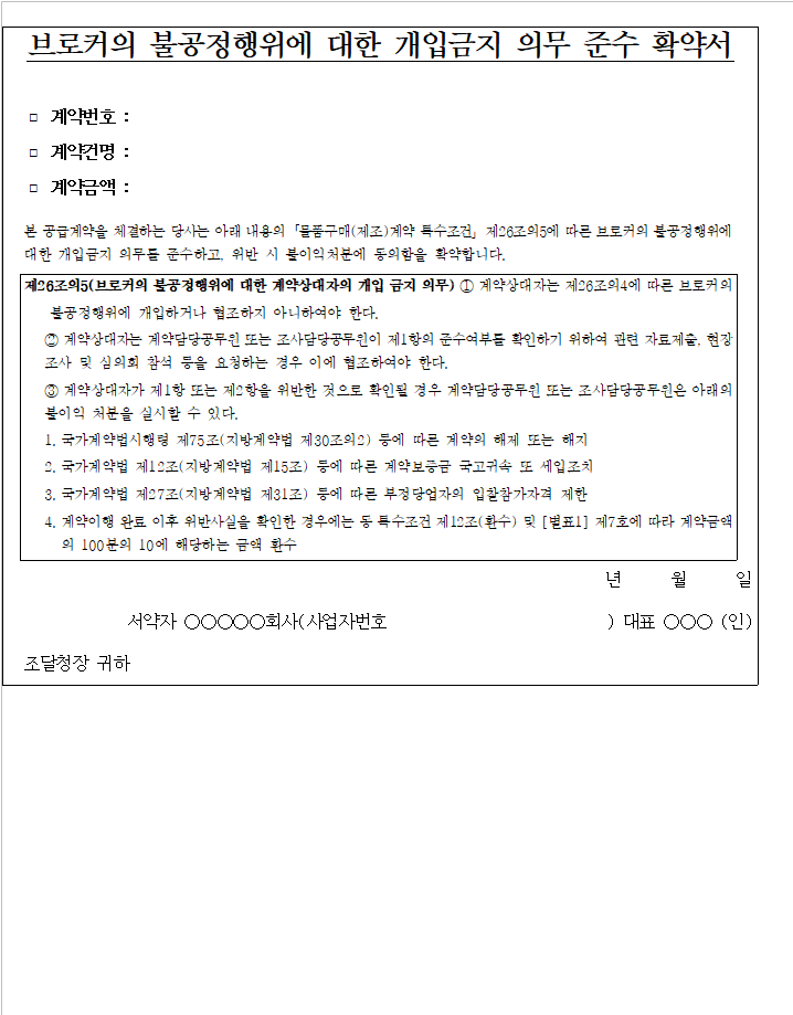 본 입찰 및 계약에 참여한 당사 대리인과 임직원은 계약 체결ㆍ이행 등의 과정(준공ㆍ납품 이후를 포함한다)에서「물품 구매(제조)계약 특수조건」제12조제1항 각 호의 어느 하나에 해당하는 부정한 행위를 한 경우에는 동 조건 [별표1]의 기준에 따른 금액을 조달청에 납부할 것을 확약합니다.