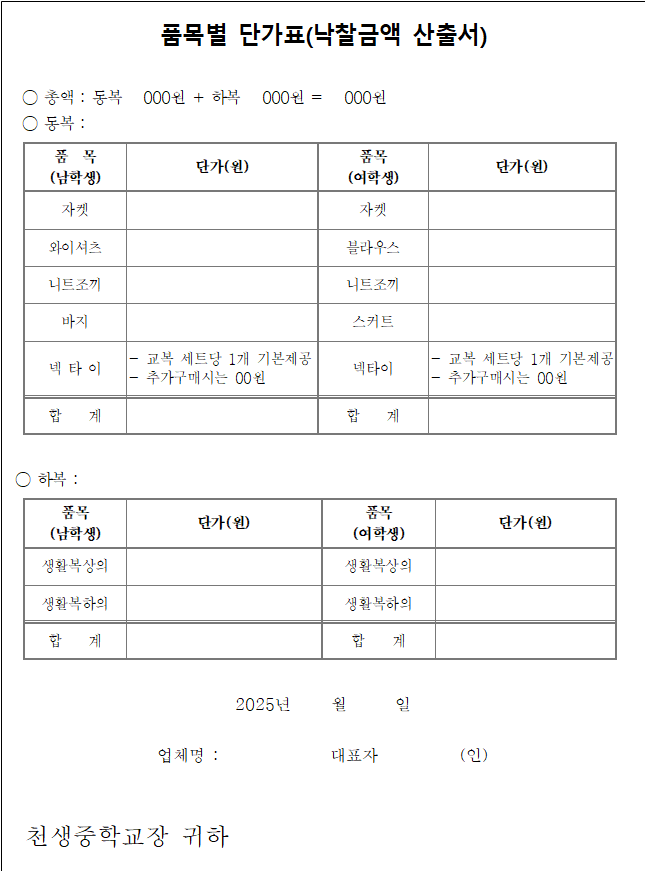 ‧ 계약상대자로 선정된 업체는 본교와 교복 구매계약 시 교복(동복‧하 복)각 1벌의 품목별 가격을 구분해서 제시하여, 본교 학생이 필요에 따라 품목별로 추가 구매 할 수 있도록 보장하여야 함.
