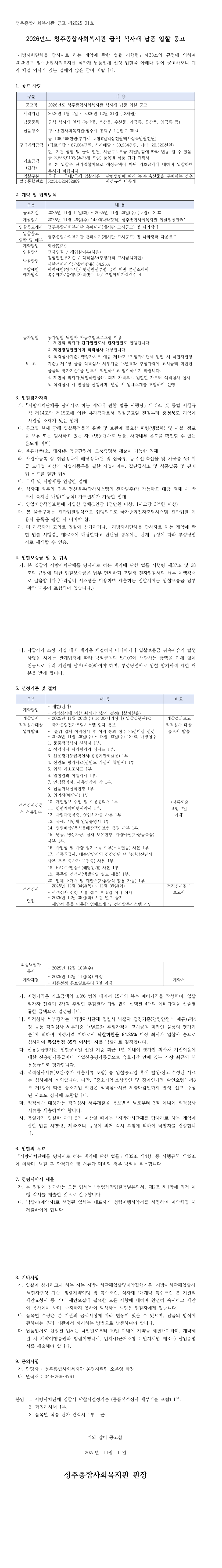 2026년도 청주종합사회복지관 급식 식자재 납품업체 입찰 공고 |