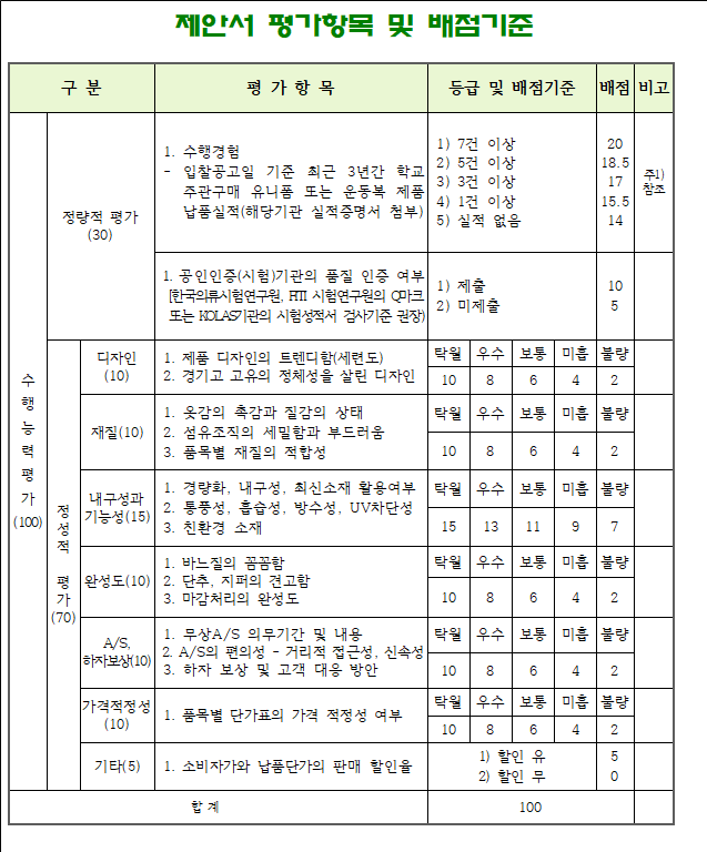 ● 낙찰업체는 본교와 계약 시 단체복 1식의 낙찰금액 산출서(품목별 단가표)를 제시하여야 함