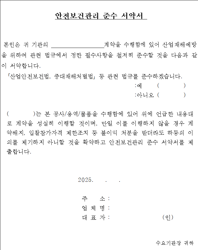 나. 본 입찰에 참가하고자 하는 자는 중대재해 예방을 위한 안전 및 보건 확보 의무사항을 숙지하신 후 입찰에 응하여야 하며, 계약 체결 시에 【붙임1】「안전보건관리 준수 서약서」를 제출하여야 합니다.