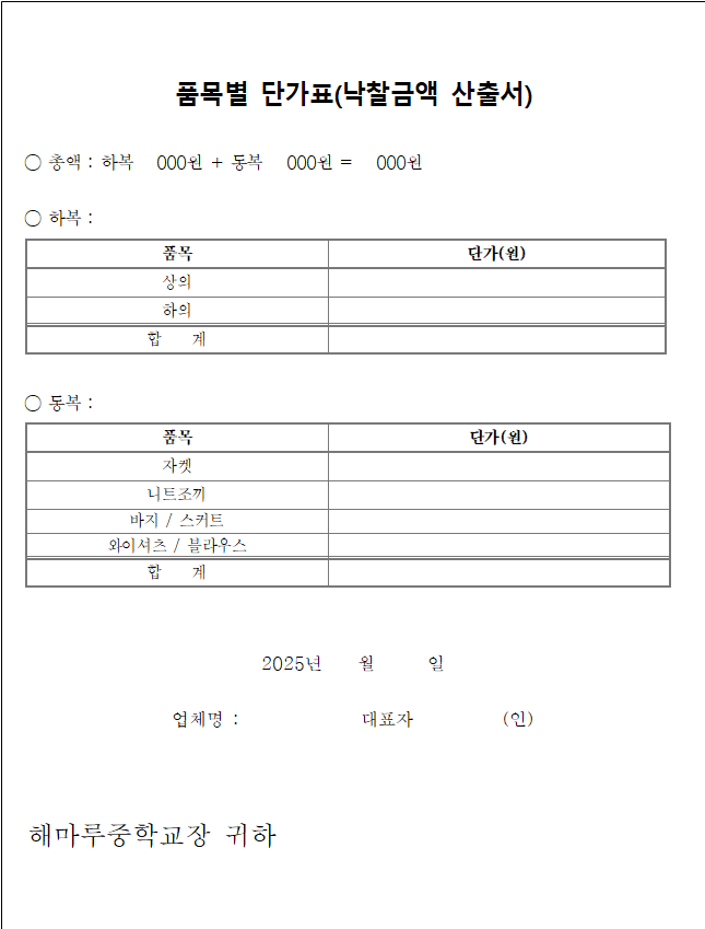 ※ 본교 교복선정위원회의 제안서 평가 후에 가격개찰이 실시되므로 제안서 평가 등 학교사정에 의해 시간이 소요될 경우 가격입찰서의 개찰일 및 낙찰자의 결정일이 연기될 수 있습니다.