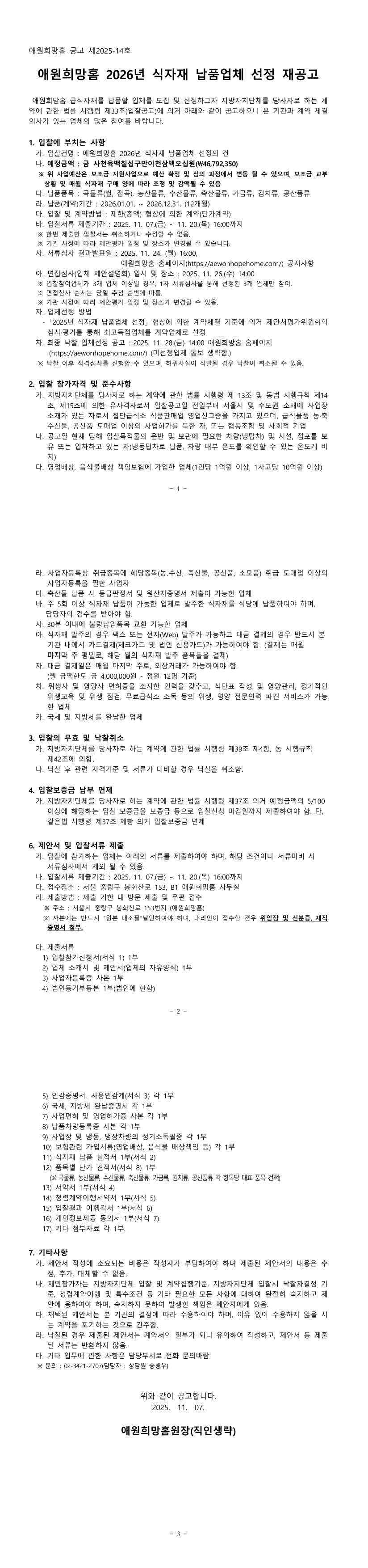 애원희망홈 2026년 식자재 납품업체 선정 |