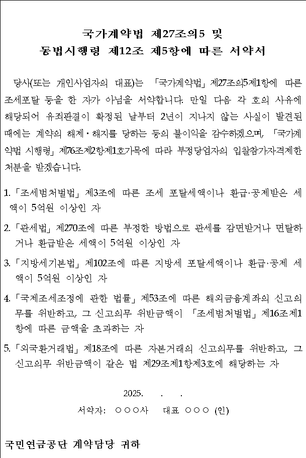※ 입찰자는 「국가를 당사자로 하는 계약에 관한 법률 시행령」 제12조제3항 각호에 해당하지 아니한다는 서약서를 입찰시 제출하여야 합니다.