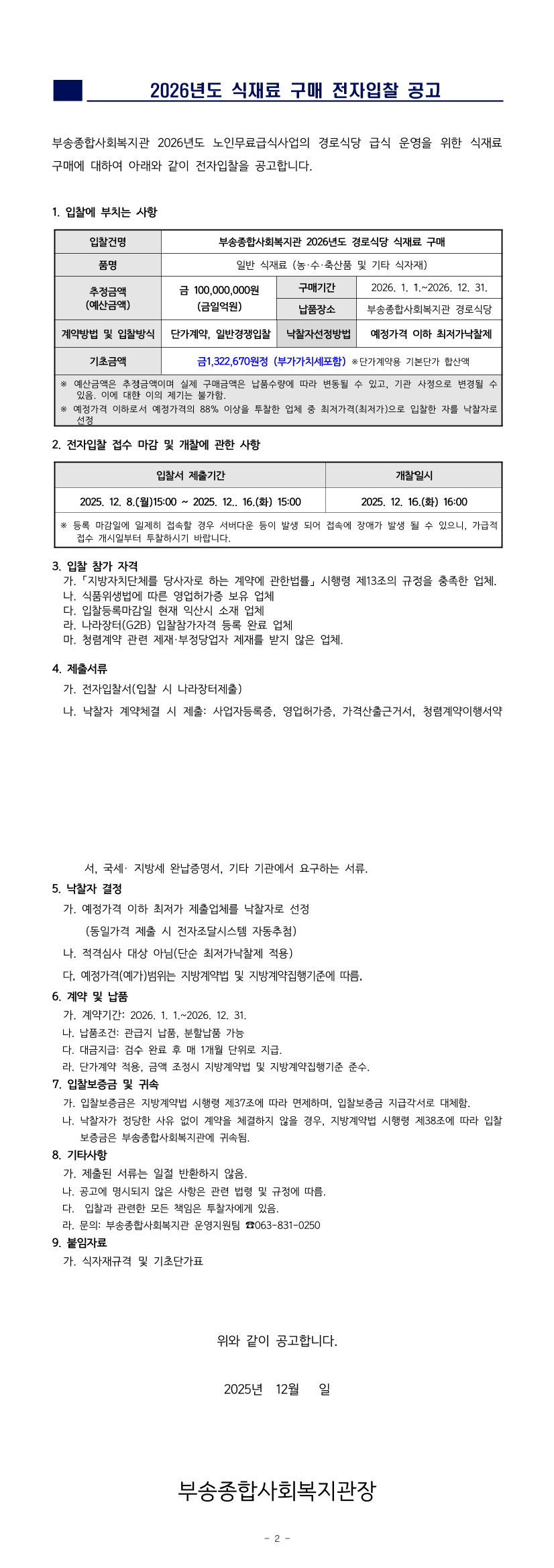 부송종합사회복지관 2026년도 식재료구매 전자입찰 공고 |