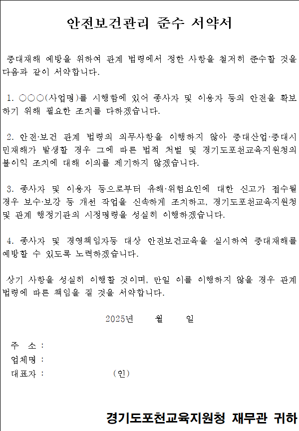 - 입찰서 제출에 참여한 자는 모두 청렴계약이행을 위한 입찰특별유의서 제2조 제1항에 따라 “청렴계약 이행각서”를 제출한 것으로 간주하고 낙찰대상자로 선정된 업체는 대표자가 서명하여 경기도포천교육지원청에 별도로 제출하여야 합니다.