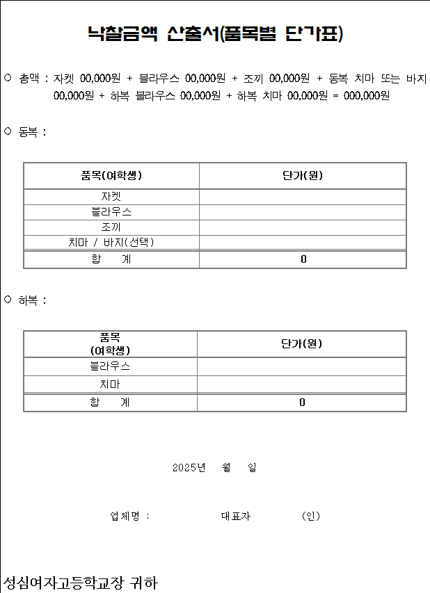 위 사업자는 서울시교육청의 교복가격 안정화를 위한 교복 ‘학교주관구매’ 실시에 따라, 성심여자고등학교(서울특별시 용산구 원효로19길 49)가 시행하는 교복 ‘학교주관구매’가 원만히 추진될 수 있도록 2025. 12. 09.일자로 공고한 입찰에 참가하기에 신고합니다.