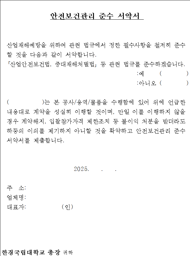 11.2. 입찰에 참여하는 자는 중대재해 예방을 위한 「안전보건관리 준수 서약서」를 숙지하신 후 입찰에 응하여야 하며, 입찰서를 제출한 자는 「안전보건관리 준수 서약서【붙임3】」를 제출한 것으로 간주합니다. 다만 계약 체결 시에는 낙찰업체의 대표자가 서명한 서약서를 제출해야 합니다.