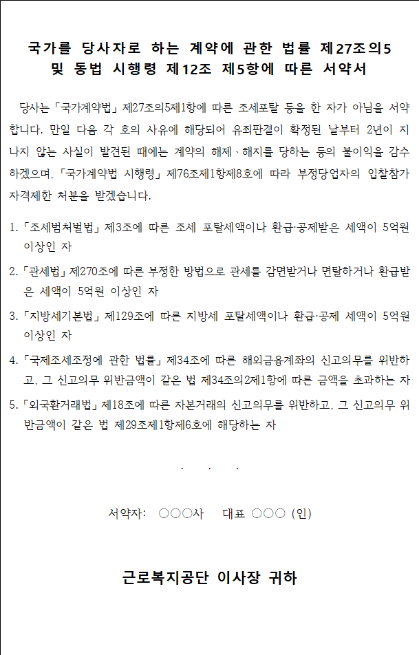 서약자 : ㅇㅇㅇ회사 대표 ㅇㅇㅇ (서명 또는 날인)