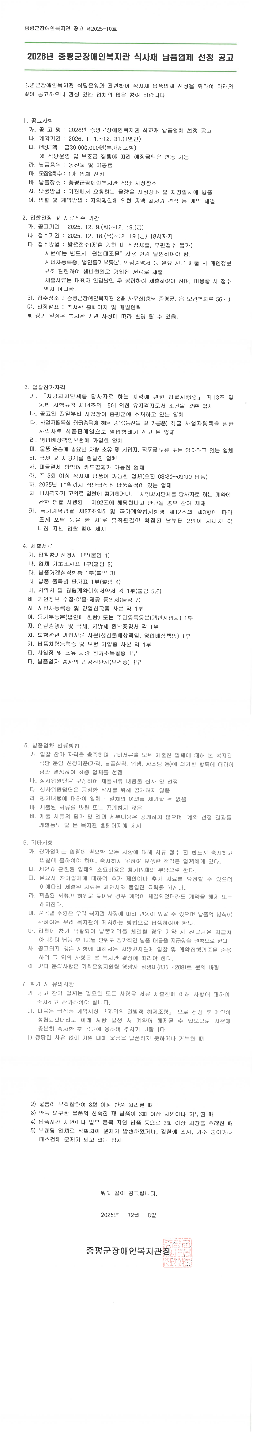 2026년 증평군장애인복지관 식자재 납품업체 선정 공고 |