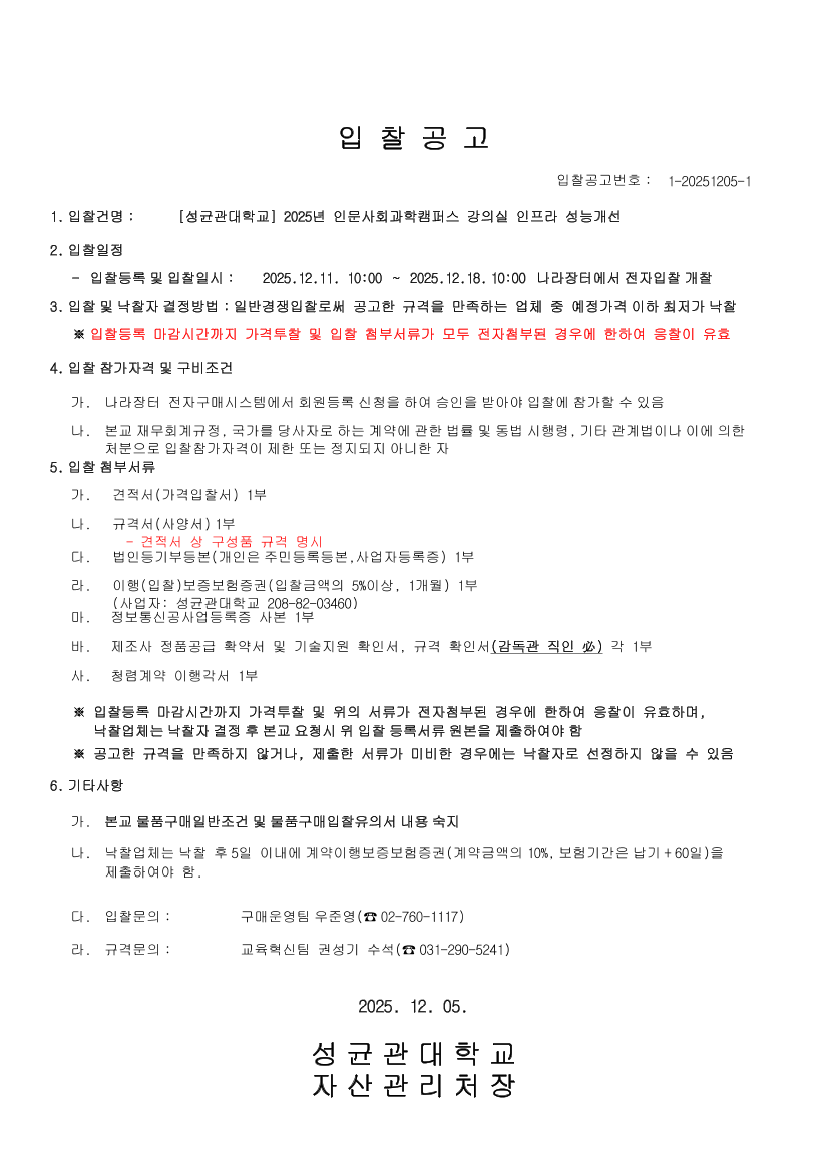 [성균관대학교] 2025년 인문사회과학캠퍼스 강의실 인프라 성능개선 |