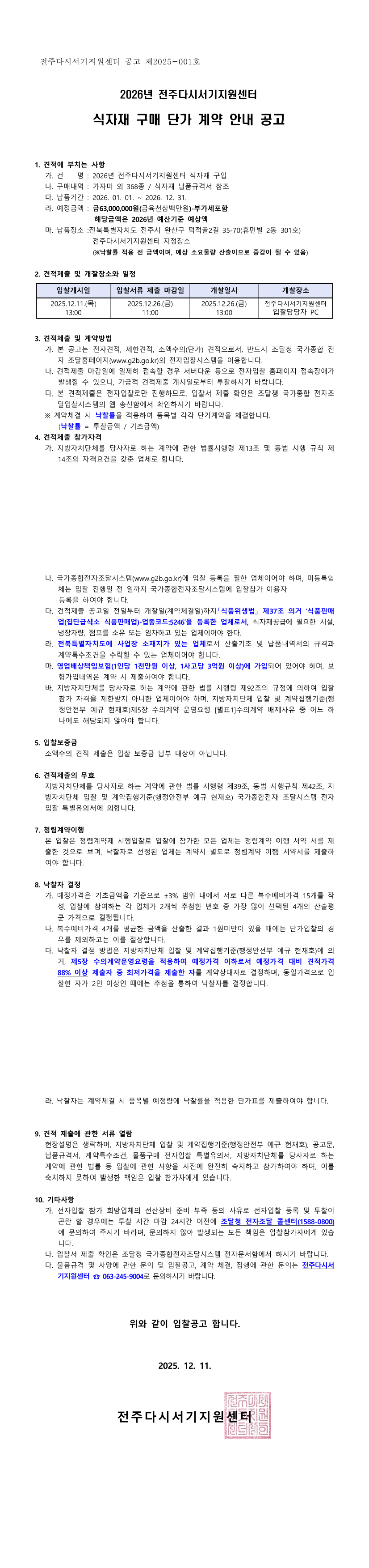 2026년 전주다시서기지원센터 식자재 구매 단가 계약 안내 공고 |