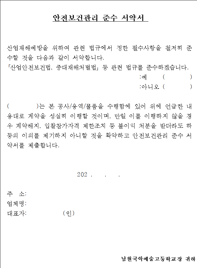 나. 본 입찰에 참가하고자하는 자는 중대채해 예방을 위한 안전 및 보건 확보 의무사항을 숙지하신 후 입찰에 응하여야 하며, 계약 체결 시에 【붙임 2】「안전보건관리계획서」와【붙임 3】‘안전보건관리 준수 서약서’를 제출하여야 합니다.