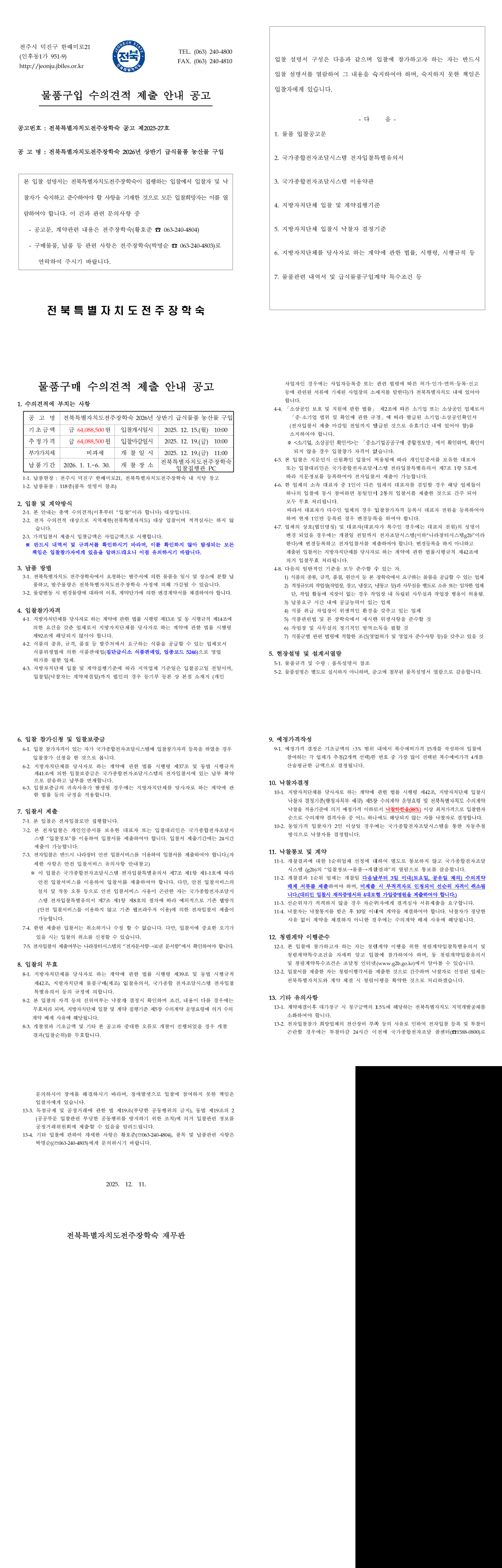 전주장학숙 2026년 상반기 급식물품 농산물 구입 |