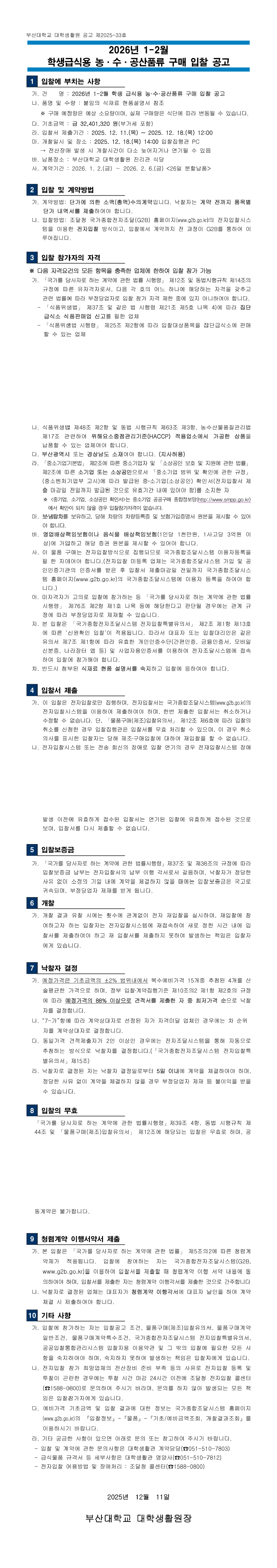 부산대학교 대학생활원 2026년 1-2월 학생급식용 농·수·공산품류 구매 입찰 공고 |