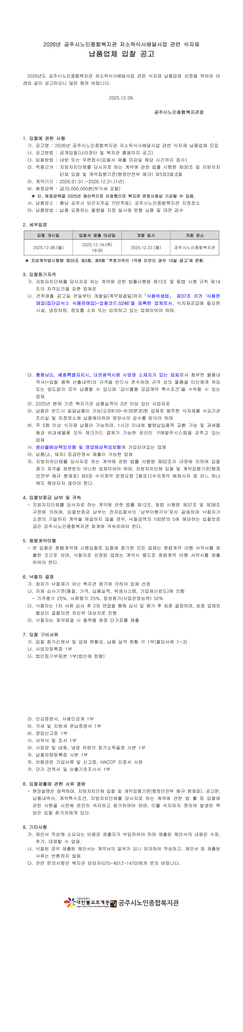 2026년 공주시노인종합복지관 저소득식사배달사업 관련 식자재 납품업체 입찰 공고 |