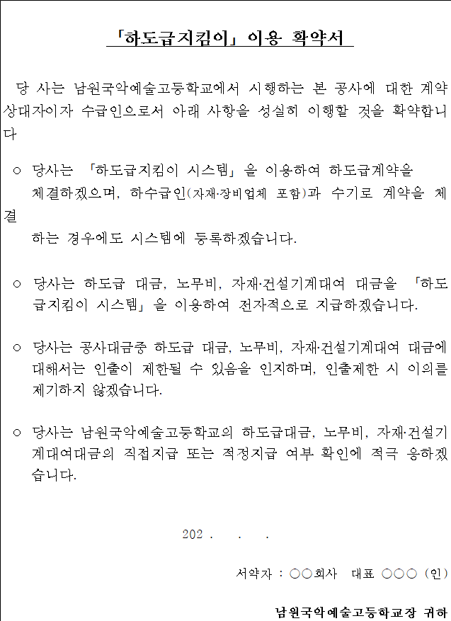 「지방계약법」제6조의2에 따라 모든 물품, 공사, 용역 등의 입찰(수의계약 포함)에 참여한 당사 대리인과 임직원은 입찰·낙찰, 계약체결 또는 계약이행 등의 과정(준공·납품 이후를 포함한다)에서 아래 각 호의 청렴계약 조건을 준수할 것이며, 이를 위반할 때에는 입찰·낙찰을 취소하거나 계약을 해제·해지하는 등의 불이익을 감수하고, 이에 민·형사상 이의를 제기하지 않을 것임을 약정합니다.