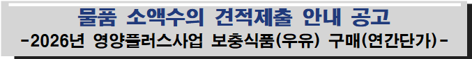 『2026년 영양플러스사업 보충식품(우유) 구매(연간단가)』 계약을 위하여 「지방자치단체를 당사자로 하는 계약에 관한 법률」제10조 및 같은법 시행령 제30조, 지방자치단체 입찰 및 계약집행기준의 규정에 따라 아래와 같이 소액수의 견적제출 안내를 공고합니다.
