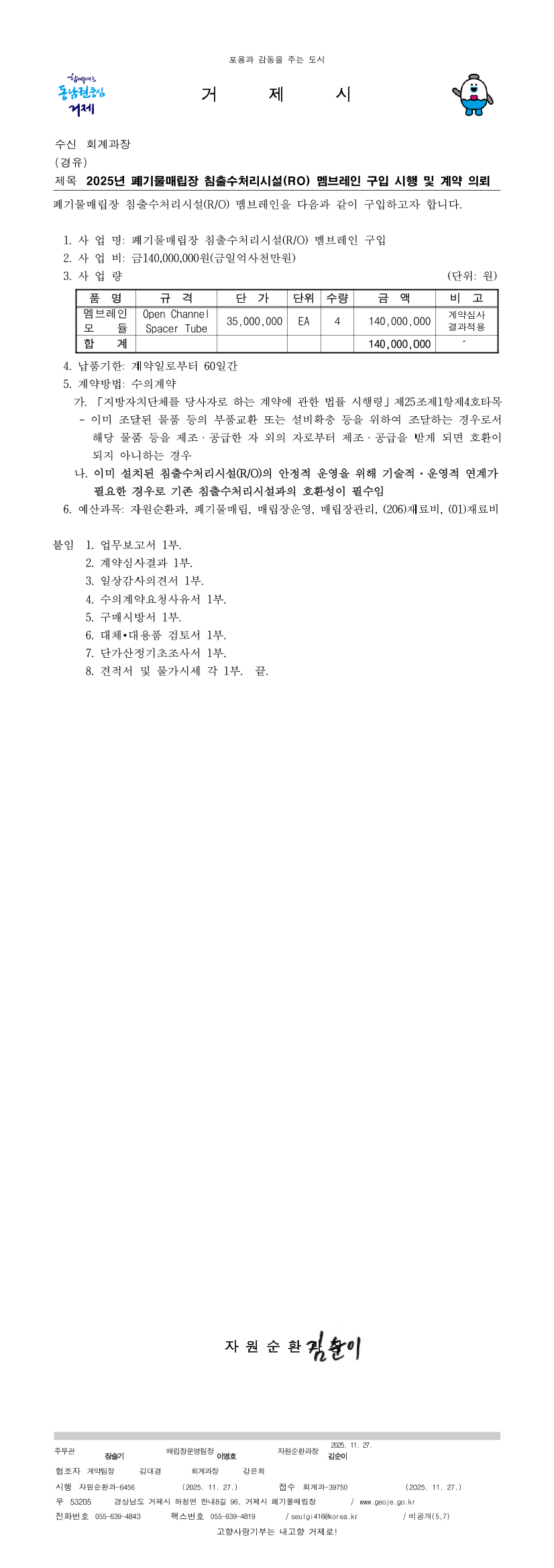 2025년 폐기물매립장 침출수처리시설(RO) 멤브레인 구입 |
