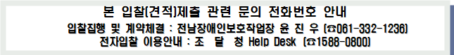 ※ 입찰참가자는 붙임 규격서를 필히 확인, 의문사항은 투찰 전 반드시 전남장애인보호작업장(061-332-1236) 담당자에게 문의 후 투찰에 임하시기 바라며, 이를 따르지 않아 발생되는 손해에 대한 책임은 전적으로 입찰 참가자에게 있습니다.