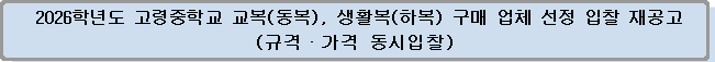 지방자치단체를 당사자로 하는 계약에 관한 법률 시행령 제18조(2단계 경쟁 등의 입찰)에 의거 2026학년도 고령중학교 학교주관 교복 구매 업체 선정을 위한 입찰을 다음과 같이 재공고합니다.