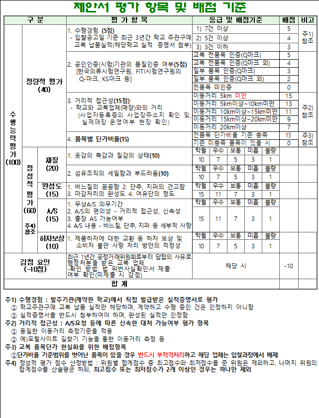 (평가위원용은 제안서, 교복 견본품에 업체명, 업체표시 문양 등을 제거하고 제출)