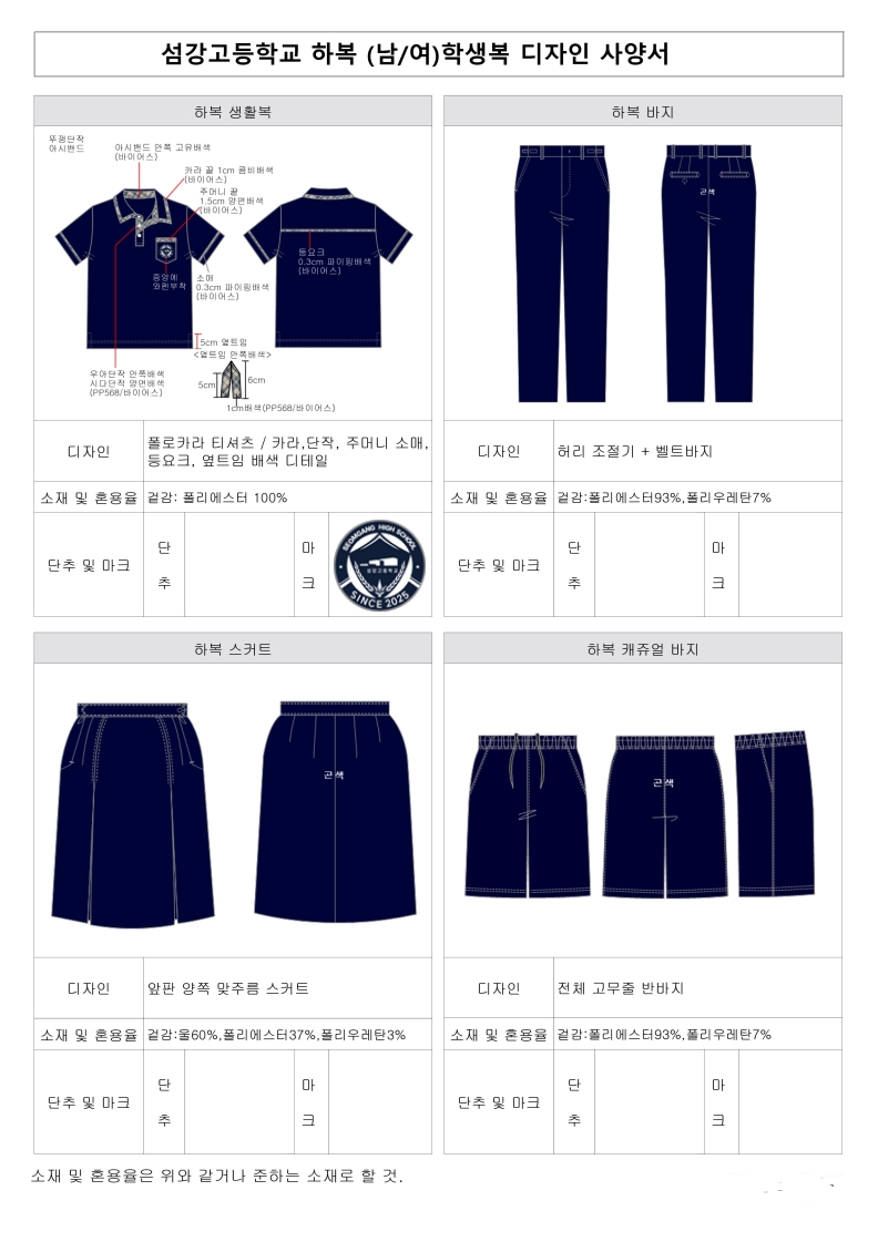 ● 섬강고등학교 교복 제작 사양서(붙임1) 참조