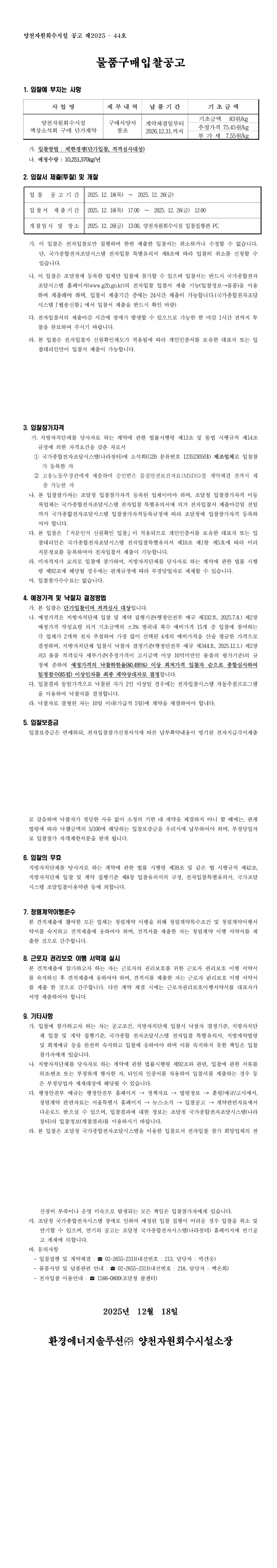 양천자원회수시설 액상소석회 구매 단가계약 |