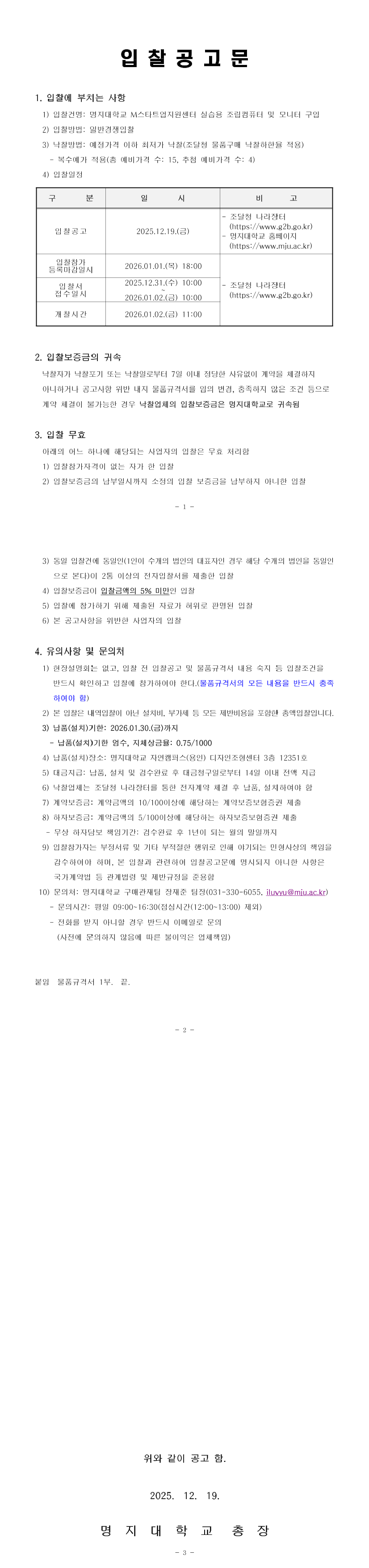명지대학교 M스타트업지원센터 실습용 조립컴퓨터 및 모니터 구입 입찰 |