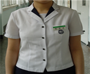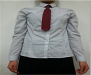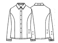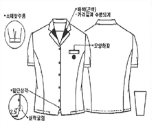 3. 디자인: 브라우스, 봉사칼라 배색 (곤색), 행거치프(학교주머니) 5㎜ 흰색, 스크래치 TAG 소매 맞주름(밑단삼각 2.5 살짝 굴림)